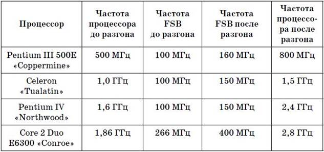 Рассмотрим примеры разгона некоторых процессоров. В табл. 18.1 приведены характеристики процессоров до и после разгона. Я привел процессоры разных поколений: от не самого современного Pentium III до стандарта сегодняшнего дня – Intel Core 2 Duo. Все процессоры одинаково хорошо разгоняются.