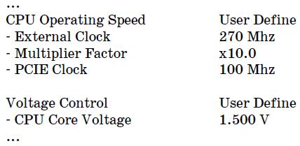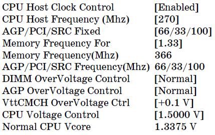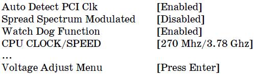 Версия BIOS от ABIT тоже довольно удобна. Вам нужно увеличивать опцию External Clock, но при этом наблюдайте за напряжением (опция CPU Core Voltage). Не забывайте о разумном пределе! BIOS выводит также множитель (Multiplier Factor), но, понятно, не позволяет его изменять. Зато с помощью множителя можно легко посчитать частоту процессора, которая получится на выходе: