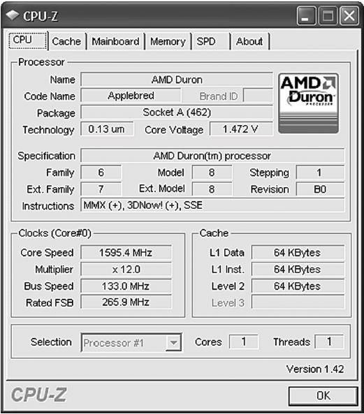 • CPU-Z – позволяет получить информацию о процессоре, материнской плате, оперативной памяти (рис. 18.7-18.8). Сугубо информационная программа, тем не менее правильно определяющая название, модель процессора, напряжение питания, размер и местонахождение кэша. Одним словом, загружайте данную программу с сайта http://www.cpuid.com/cpuz.php – не пожалеете;