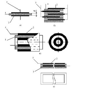а – конденсатор плоский; б – конденсатор плоский многопластинчатый; в – конденсатор цилиндрический; г – конденсатор спиральный (условно развернут); 1 – прокладка (прокладки); 2 – электроды; 3 – выводы