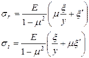 Из теории упругости известно, что связь между напряжениями и полным удлинением диска при радиусе у выражена соотношениями: