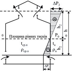 . Приймемо площину рівних тисків приблизно на середині висоти приміщення цеху. Умовно приймемо, що тиск на рівні площини рівних тисків і в довколишній атмосфері дорівнює нулю. Тоді вага стовпа повітря заввишки