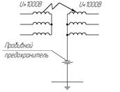 Мережі напругою до 1000В, які зв'язані через трансформатор, мають бути захищені від можливої появи в них високої напруги. Цей захист здійснюється за допомогою пробивного запобіжника. Електрична схема захисту представлена на рис. 4.14. у нейтралі і на рис. 4.15. у фазі. Пробивні запобіжники складаються з 2-х металевих дисків, ізольованих один від одного слюдяною прокладкою певної товщини з отворами. Один диск з'єднується з нейтраллю чи фазою вторинної обмотки, а інший - із заземляючим пристроєм.