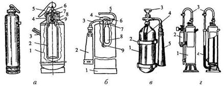 Серед первинних засобів пожежогасіння особливе місце займають вогнегасники. Залежно від вогнегасних речовин, що використовуються, вогнегасники ділять на пінні, газові та порошкові (рис. 11.1).