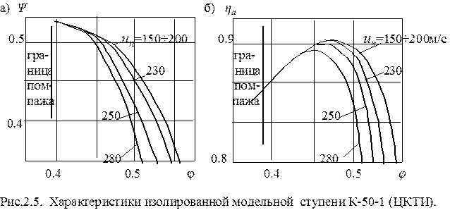 Из рис.2.5 б) следует, что для каждой частоты вращения ротора (окружной скорости) существует оптимальное значение коэффициента расхода φopt, соответствующее максимальному значению изоэнтропийного КПД. Отклонения от φopt приводят к уменьшению ηа, что является следствием увеличения потерь энергии в решетках профилей от угла атаки. Особенно неблагоприятны положительные углы атаки, вызывающие отрыв потока от выпуклой части компрессорного профиля.