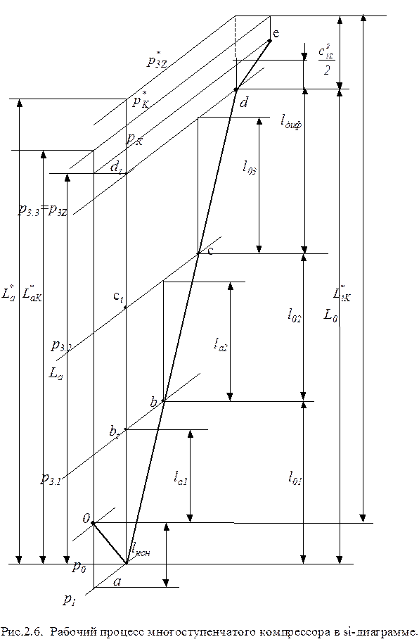 Рабочий процесс в si-диаграмме для многоступенчатого компрессора показан на рис.2.6. При построении диаграммы принято, что скорости входа и выхода в ступенях одинаковые, поэтому действительные и теоретические напоры ступеней, определяемые по статическим и полным параметрам равны между собой (