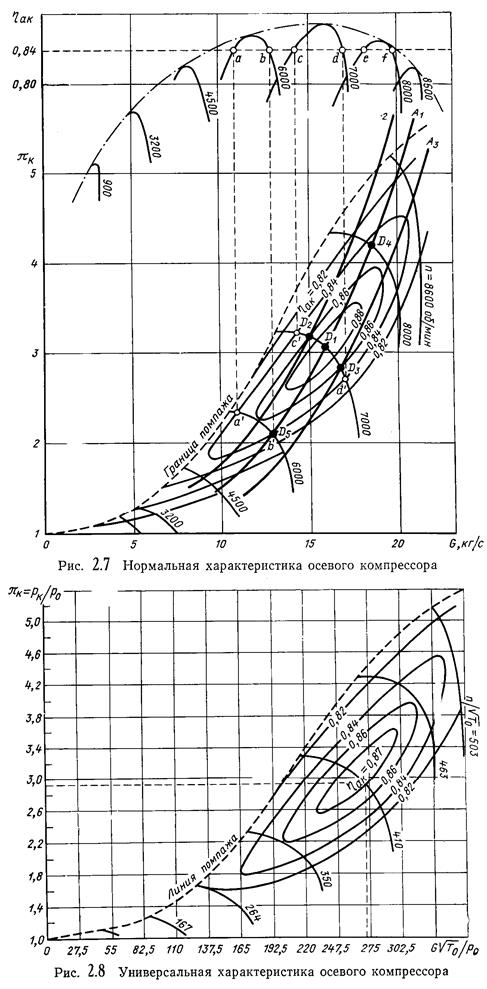 Нормальная характеристика представляет зависимости степени повышения давления πк=рк/р0 и изоэнтропийного КПД ηак компрессора от его подачи G, полученные при постоянных частотах вращения ротора n и неизменных параметрах на входе р0,Т0. Нормальные характеристики строят по результатам испытаний компрессора.