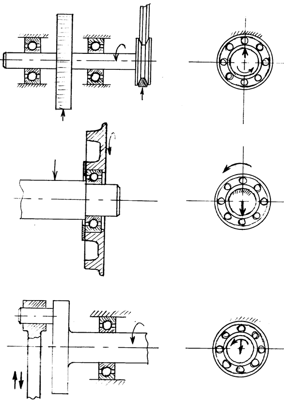 С зазором монтируют то кольцо, которое испытывает местное нагружение; при такой посадке устраняется заклинивание шариков, а кольцо, смонтированное с зазором под действием толчков и вибрацией постепенно поворачивается по посадочной поверхности, благодаря чему износ беговой дорожки происходит равномерно по всей окружности кольца, что увеличивает срок службы подшипника