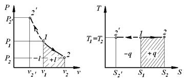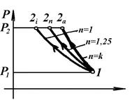 Процеси стискування можуть проходити по адіабаті 1-2а, політропі – 1-2n, ізотермі – 1-2і. Найменша робота, яка затрачується на стискування відповідає ізотермічному процесу, що видно з порівняння площ: пл. Р1-2і-Р2-Р1<пл. Р1-1-2п-Р2-Р1< пл. Р1-1-2а-Р2-Р1, або