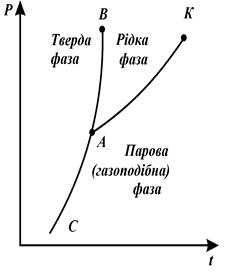 | Рівноважні криві: АВ – плавлення; АК – пароутворення; АС – сублімація. Точка, у якій речовина існує в трьох агрегатних станах, називається потрійною точкою (т.А). Лінія пароутворення закінчується критичною точкою К. Її параметри. У цій точці: 1. Питомий об'єм рідини і газу рівні один одному. 2. Рідина переходить в пару минувши двофазний стан. Ніяким зусиллям стиснення неможливо сконденсувати пару. |