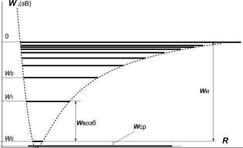 На рис.2.2 схематично представлены уровни энергии электрона в молекуле (атоме). Минимальная энергия свободного электрона принята равной нулю.