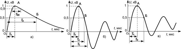 Испытания коммутационными импульсами напряжения. При испытаниях оборудования переменного тока на напряжения 330 кВ и выше применяют коммутационные импульсы напряжения апериодический (рис. 6.2 а) и колебательные – периодические (рис. 6.2 б,в), параметры которых определяются ГОСТом.