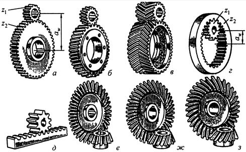 Зубчатые передачи, между параллельными валами осуществляются цилиндрическими колесами с прямыми, косыми и шевронными зубьями (рис.3.1,а-г) называют цилиндрическими. Существуют передачи (рис.3.1,а,б,в) внешнего зацепления и передачи (рис.3.1,г) внутреннего зацепления.. Передачи между валами с пересекающимися осями осуществляются коническими колесами с прямыми и круговыми зубьями (рис.3.1,е,з) реже тангенциальными зубьями (рис.3.1,ж). Зубчатые передачи для преобразования вращательного движения в поступательное осуществляют цилиндрическим колесом и рейкой (рис.3.1,д).