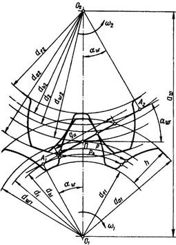 d=pz/π — делительный диаметр; db=dcosα — основной диаметр (диаметр окружности, разверткой которой являются эвольвенты зубьев); dw1―начальные диаметры (диаметры окружностей, по которым пара зубчатых колес обкатывается в процессе вращения):