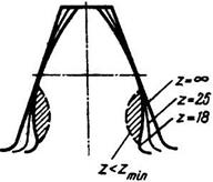 Влияние числа зубьевна форму и прочность зубьев. На рис.3.7 показано изменение формы зуба в зависимости от числа зубьев колес, нарезанных без смещения с постоянным модулем. При z→∞ колесо превращается в рейку, и зуб приобретает прямолинейные очертания. С уменьшением z уменьшается толщина зуба у основания и вершины, а также увеличивается кривизна эвольвентного профиля. Такое изменение формы приводит к уменьшению прочности зуба. При дальнейшем уменьшении z появляется подрезание ножки зуба (штриховая линия на рис. 3.7), прочность зуба существенно снижается.