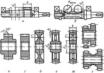 Конструкция зубчатых колеспоказана на рис.3.9. Шестерни с диаметром впадин df, близким к диаметру вала dВ, изготовляют заодно с валом (рис.3.9,а,б). Шестерни и колеса небольшого диаметра (dа≤200 мм) выполняют в виде дисков со ступицами или без ступиц (рис.3.9,в,г). В коробках передач применяют блоки шестерен (рис.3.9,з). Зубчатые колеса и блоки шестерен в зависимости от серийности производства изготовляют штамповкой, ковкой или точением из прутка. Коэффициент использования металла при точении шестерен из прутка равен в среднем 3, при штамповке в закрытых штампах он в 2 раза выше.