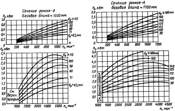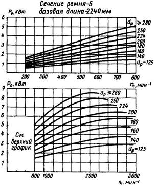 1.Сечение ремня выбирают по графику рис. 11.23, где область применения данного сечения (например, Б) расположена выше собственной линии и ограничена линией предыдущего сечения (например, А).