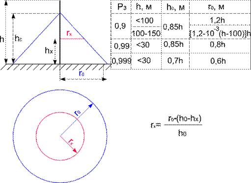 Рис. 7.12. Зона защиты одиночного стержневого молниеотвода