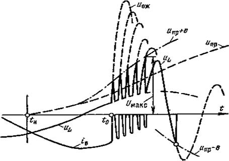 В момент пересечения этих кривых дуга между контактами возникает вновь и рост напряжения на этом прекращается. Однако, поскольку сохраняются предпосылки для среза тока дуги, через сравнительно небольшой отрезок времени после ее зажигания она гасится вновь, и процесс повторяется.