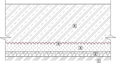 Рис. 20. Компоненты системы ТН-ПОЛ Барьер: 1 – железобетонная плита перекрытия; 2 – выравнивающая стяжка; 3 – праймер битумный ТЕХНОНИКОЛЬ №01; 4 – гидроизоляционный слой Техноэласт БАРЬЕР; 5 – армированная цементно-песчаная стяжка;