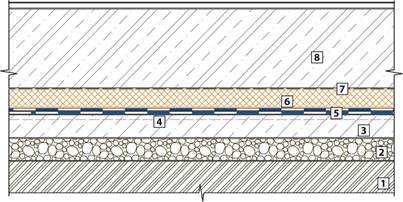Рис. 5. Компоненты системы ТН-ПОЛ Гидро: 1 – грунт; 2 – щебень; 3 – бетонная подготовка; 4 – праймер битумный ТЕХНОНИКОЛЬ №01; 5 – гидроизоляция Техноэласт ЭПП, 2 слоя; 6 – экструзионный пенополистирол ТЕХНОНИКОЛЬ; 7 – пароизоляционная пленка ТехноНИКОЛЬ; 8 – железобетонная плита пола