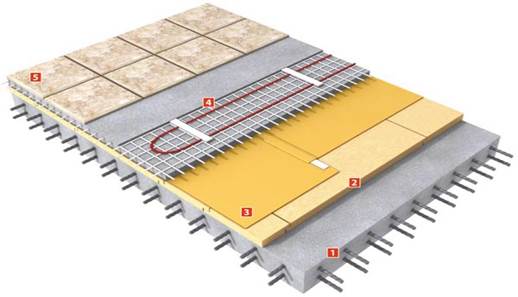 Рис. 12. ТН-ПОЛ Термо: 1 – железобетонная плита перекрытия; 2 – экструзионный пенополистирол ТЕХНОНИКОЛЬ; 3 – пленка полиэтиленовая; 4 – цементно-песчаная стяжка с нагревательными элементами; 5 – покрытие пола, плитка