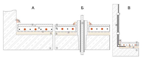 Рис. 14. Компоненты технических решений: А – примыкание к стене; Б – проход коммуникаций; В – расположение датчиков; 1 – железобетонная плита перекрытия; 2 – теплоизоляционный слой, ТЕХНОНИКОЛЬ 30–250 СТАНДАРТ; 3 – пленка полиэтиленовая