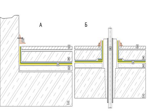 Рис. 25. Технические решения: А – примыкание к стене; Б – проход коммуникаций; 1 – железобетонная плита перекрытия; 2 – экструзионный пенополистирол ТЕХНОНИКОЛЬ; 3 – пароизоляционная пленка ТехноНИКОЛЬ; 4 – сборная стяжка; 5 – материал