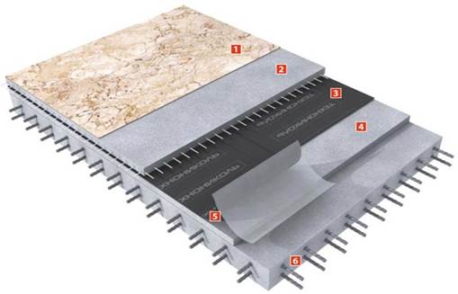 Рис. 16. Компоненты системы ТН-ПОЛ Акустик: 1 – железобетонная плита перекрытия; 2 – выравнивающая стяжка; 3 – гидро-звукоизоляционный материал Техноэласт АКУСТИК СУПЕР; 4 – армированная цементно–песчаная стяжка; 5 – покрытие пола, плитка