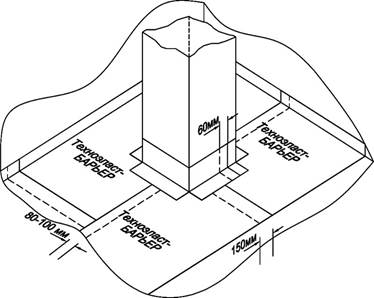 Место сопряжения поверхностей, например при подходе к колонне (рис.3), следует проклеивать самоклеящимся битумно-полимерным материалом Техноэласт БАРЬЕР.