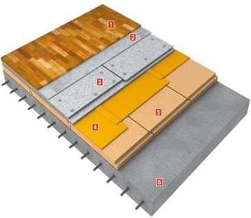 Рис. 24. Компоненты системы ТН-ПОЛ Стандарт: 1 – железобетонная плита перекрытия; 2 – экструзионный пенополистирол ТЕХНОНИКОЛЬ; 3 – пароизоляционная пленка ТехноНИКОЛЬ; 4 – сборная стяжка; 5 – материал подложки; 6 – ламинированный паркет
