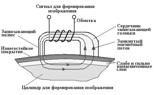 Запись изображения осуществляется с помощью магнитных пишущих головок, которые изменяют направленность магнитных диполей в верхнем слое магнитного материала. В самом простейшем варианте пишущая головка представляет собой кусок проволоки или наконечник из мягкого железа, обмотанный изолированной медной проволокой.