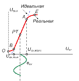 После точки «А» ─ явно выраженные нелинейные искажения входного сигнала. Уровень нелинейных искажений оценивается коэффициентом нелинейных искажений