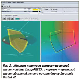 Первой и одной из главных особенностей описываемой серии машин является новый тонер, получивший название V-toner, от слова vivid (интенсивный, яркий). Тонер специально разработан для получения цветового охвата, превышающего традиционный офсетный процесс (рис. 2). Это позволяет, используя системы управления цветом, хорошо имитировать цветовой охват офсетного оттиска. При этом, если встанет задача напечатать что то более ярко и насыщенно, то и с этим тонер легко справится.