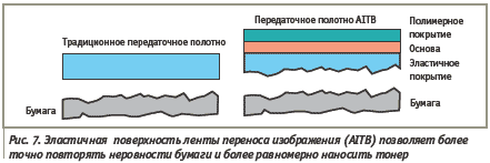 Помимо этого, для еще большей равномерности нанесения разработано специальное эластичное передаточное полотно, переносящее изображение на бумагу. Поскольку бумага имеет шероховатую поверхность, то при нанесении тонера жестким передаточным полотном он оказывается только на выступающих частях, что сильно ухудшает равномерность нанесения тонера. Ситуация еще больше усугубляется при использовании рельефных или фактурных бумаг. «Мягкое» передаточное полотно работает подобно офсетному (рис. 7) в традиционной печати, равномерно заполняя все неровности поверхности бумаги тонким слоем тонера. В дополнение к новому тонеру был также разработан новый оптический барабан с повышенной износоустойчивостью, названный E-Drum. Этот барабан намного дольше сохраняет свои изначальные характеристики, гарантирующие стабильную печать в течение долгих месяцев. Таким образом, серия новых разработок в области тонера и технологии его нанесения позволила выйти нановый уровень качества электрографической печати, но сохранились возможности дальнейшего развития технологии электрографии.