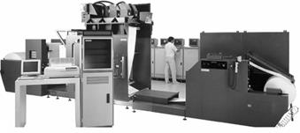 По принципу непрерывного действия построена высокоскоростная струйная печатная система 3600 фирмы Scitex Digital Printing (рис. 19.8). Система состоит из двух последовательно расположенных модулей для печати на рулонном материале. Отдельная головка имеет длину около 108 мм, расположение сопел позволяет получить разрешение 240 dpi (1024 сопла в одной головке), скорость печати до 2 м/с.