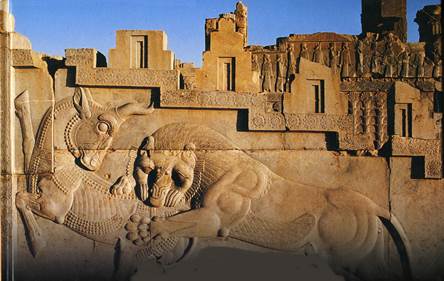 a – лев, терзающий быка – символ равноденствия (рельеф из Персеполя); б – лучники царской гвардии (дворец Артаксеркса II в Сузах)