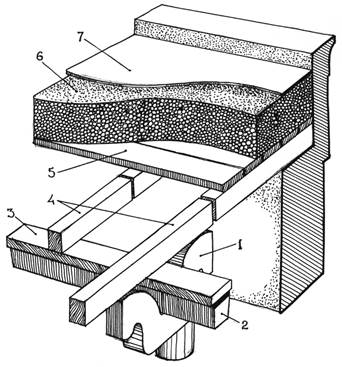 4 – брусья наката; 5 – дощатый настил; 6 – грунт; 7 – листы серебра). Протома – опора покрытия