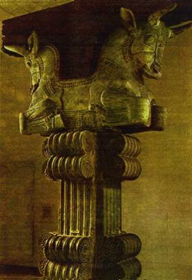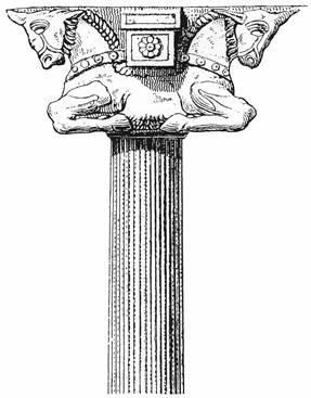 Верхняя часть капители – протома (два переда лежащих животных – быков, львов или лошадей). Они украшались нарядными шлеями и несли на своих спинах балку, украшенную золотым розетками (рис. 9.21).
