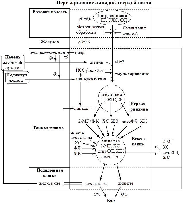 Водонерастворимые продукты гидролиза (жирные кислоты с длинной цепью, 2-МГ, холестерол, лизолецитины, фосфолипиды) вместе с компонентами желчи (солями жёлчных кислот, ХС, ФЛ) образуют в просвете кишечника структуры, называемые смешанными мицеллами. Смешанные мицеллы построены таким образом, что гидрофобные части молекул обращены внутрь мицеллы (жирные кислоты, 2-МГ, 1-МГ), а гидрофильные (желчные кислоты, фосфолипиды, ХС) — наружу, поэтому мицеллы хорошо растворяются в водной фазе содержимого тонкой кишки. Стабильность мицелл обеспечивается в основном солями жёлчных кислот, а также моноглицеридами и лизофосфолипидами.