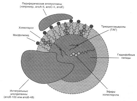 Липопротеины (ЛП) – это надмолекулярные комплексы сферической формы, состоящие из липидов, белков и углеводов. ЛП имеют гидрофильную оболочку и гидрофобное ядро. В гидрофильную оболочку входят белки и амфифильные липиды - ФЛ, ХС. В гидрофобное ядро входят гидрофобные липиды - ТГ, эфиры ХС и т.д. ЛП хорошо растворимы в воде.