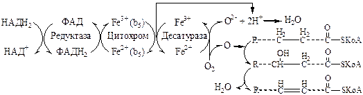 Стеароил-КоА-десатураза – интегральный фермент, содержит негеминовое железо. Катализирует образование 1 двойной связи между 9 и 10 атомами углерода в ЖК. Стеароил-КоА-десатураза переносит электроны с цитохрома b5 на 1 атом кислород, при участии протонов этот кислород образует воду. Второй атом кислорода включается стеариновую кислоту с образованием её оксиацила, который дегидрируется до олеиновой кислоты.