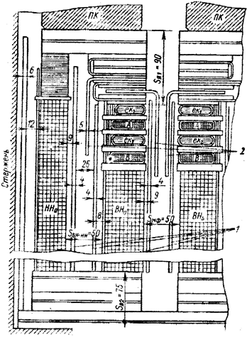 | Рис.4.6.3. Изоляция двухобмоточного трансформатора 110кВ с вводом на краю обмотки. 1 - барьеры из электрокартона; 2 – угловые шайбы. НН, ВН - обмотки высшего и низшего напряжения фазы ; ПК - зазмленное пресующее кольцо; ек - емкостные кольца; А и В - катушки входной зоны. |