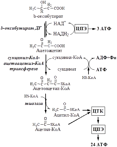 1. β-Гидроксибутират, попадая в клетки, дегидрируется НАД-зависимой дегидрогеназой и превращается в ацетоацетат. НАДН2 направляется ЦПЭ;