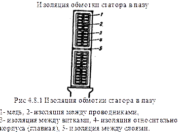 Обмотка каждой фазы статора вращающейся машины состоит из нескольких соединенных последовательно катушек, соответственным образом уложенных в пазы. Число витков в каждой катушке зависит от номинального напряжения и мощности машин, а также скорости вращения ротора. В мощных машинах для уменьшения потерь в меди применяются параллельные проводники. В соответствии с этим изоляция статорных обмоток вращающихся машин подразделяется на следующие части ( рис 4.8.1):