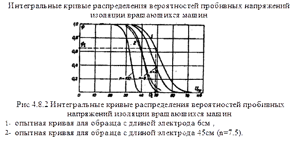 Хотя изоляция вращающихся машин работает в очень тяжелом тепловом режиме, пробой изоляции на промышленной частоте, как правило, а связан с развивающимися процессами. Величены пробивных напряжений изоляции электрических машин получают из опытов, проводимых на отдельных секциях обмотки, площадь изоляции которых составляет небольшую долю площади изоляции всей машины в целом. Если бы разбросы в пробивных напряжениях изоляции отсутствовали, такие эксперименты давали бы точные значения пробивных напряжении как для испытуемой секции, так и для всей обмотки. При наличии значительных разбросов пробивных напряжений данные, полученные на малом образце, нельзя непосредственно применять к большому образцу.