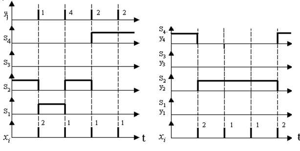 Как видно, автомат Мили с учётом начального состояния s2 последовательно находился в состояниях s2, s1, s2, s4, s4 с выдачей сигналов y1, y4, y2, y2, а автомат Мура с учётом начального состояния s4 последовательно находился в состояниях s4, s2, s2, s2, s4 с выдачей сигналов y4, y2, y2, y2, y4.