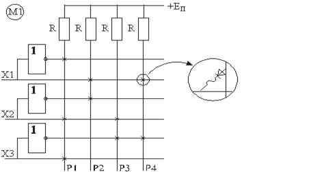 Реализация Булевых функций с помощью матричных схем. Матричные схемы представляют собой сетку ортогональных проводников, на местах пересечения которых установлены элементы односторонней проводимости (ЭОП) (диоды, транзисторы). Матричные схемы бывают 2-х и 3-х уровневые. Каждый уровень называется матрицей. Матрица первого уровня называется матрицей М1, матрица второго уровня - М2.