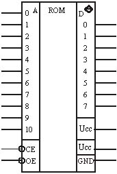 А - адресные входы; D – информационные выходы. Uce – вход подачи напряжения записи (в режиме хранения на этот вход подается Ucc); Ucc – вывод для подачи напряжения питания. СЕ и ОЕ –входы управления состоянием выводов, если СЕ=ОЕ=1, входы D имеют высокоимпедансное состояние. При СЕ=ОЕ=0 вывод информации разрешен.