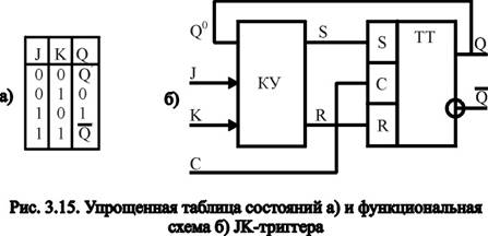 Упрощенная таблица (таблица управления) состояний JK-триг-гера содержит четыре строки (рис. 3.15, а).
